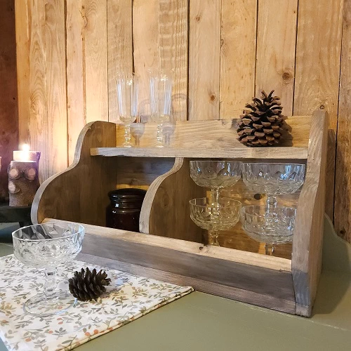 Deze sfeervolle,  medium formaat gruttersbak van Ruralia’s Living is gemaakt van nieuw vurenhout en is voorzien van twee vakken en een legplank.