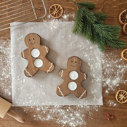 Dit sfeervolle, vrolijke, waxinelichthoudertje is gemaakt van gerecycled hout in de vorm van een vrolijk peperkoekmannetje. Op zijn buik is plaats voor twee standaard waxinelichtjes.