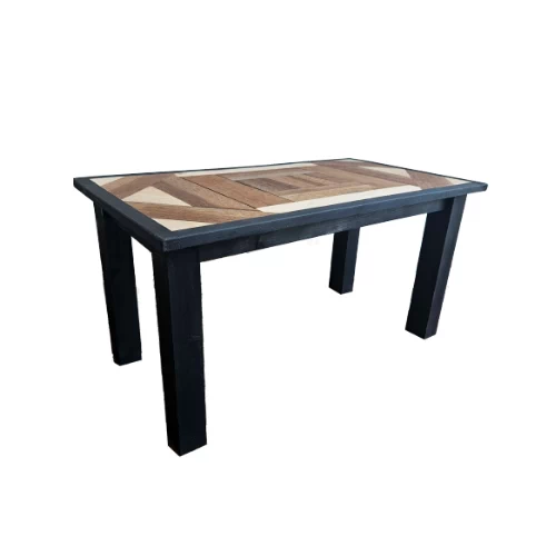 Deze sfeervolle, compacte bijzettafel is gemaakt van gerecycled hout. Het frame van de tafel is afgewerkt met een zwarte beits en het tafelblad is sierlijk vormgegeven met smalle stukjes hout in naturel en bruintinten , die deze tafel tot een ware eyecatcher maken.